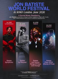Multi-Grammy® and Academy Award® winner Jon Batiste today announced that he will bring his boundary-breaking artistry to KOKO in London for a special four-night residency of exhilarating, diverse and concept-driven performances from Wednesday, June 24, 2026, through Sunday, June 28, 2026. The performances are part of the inaugural JON BATISTE WORLD FESTIVAL, curated by Batiste and co–curated by Michael Mwenso, with additional dates to be announced soon.